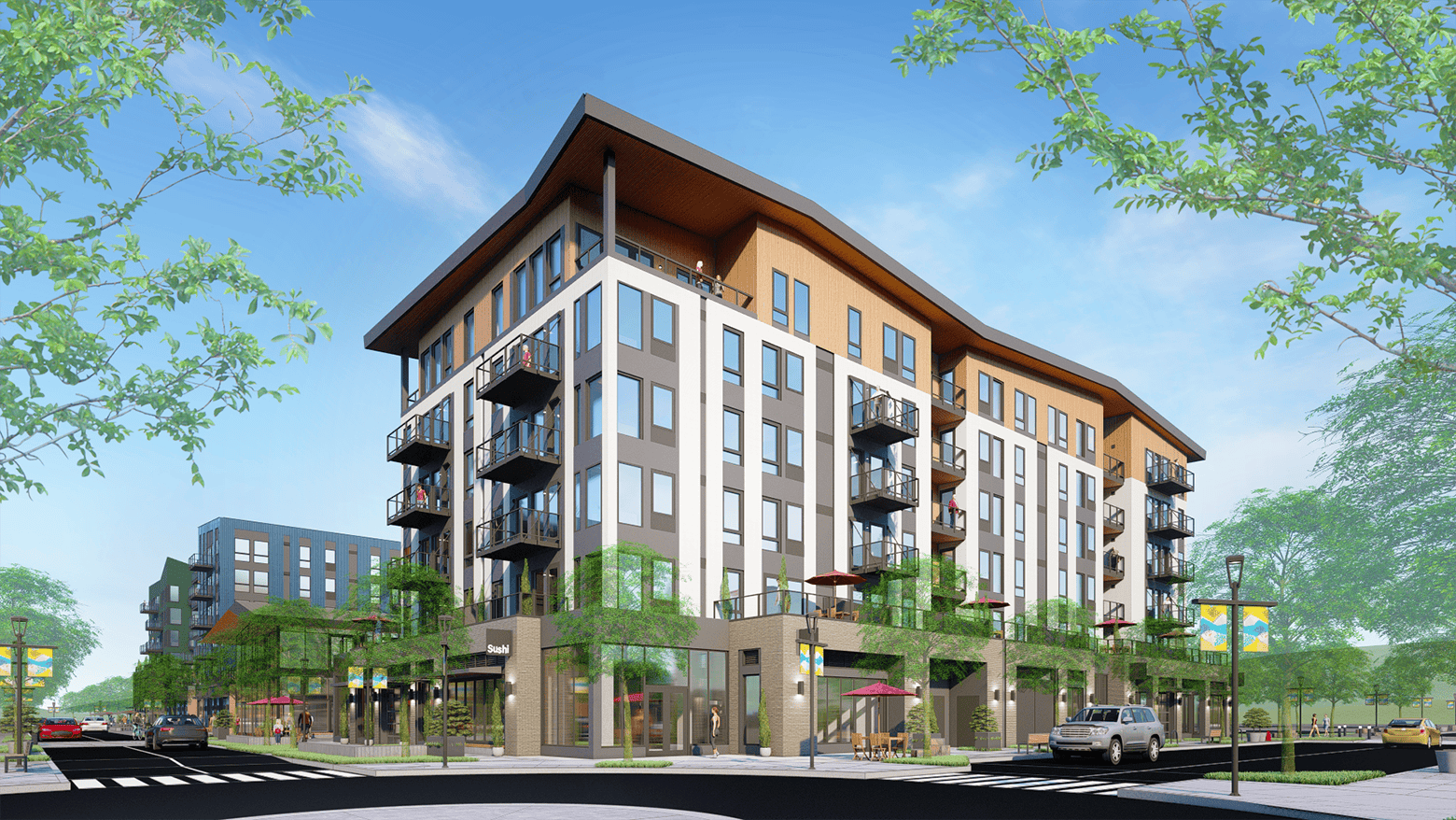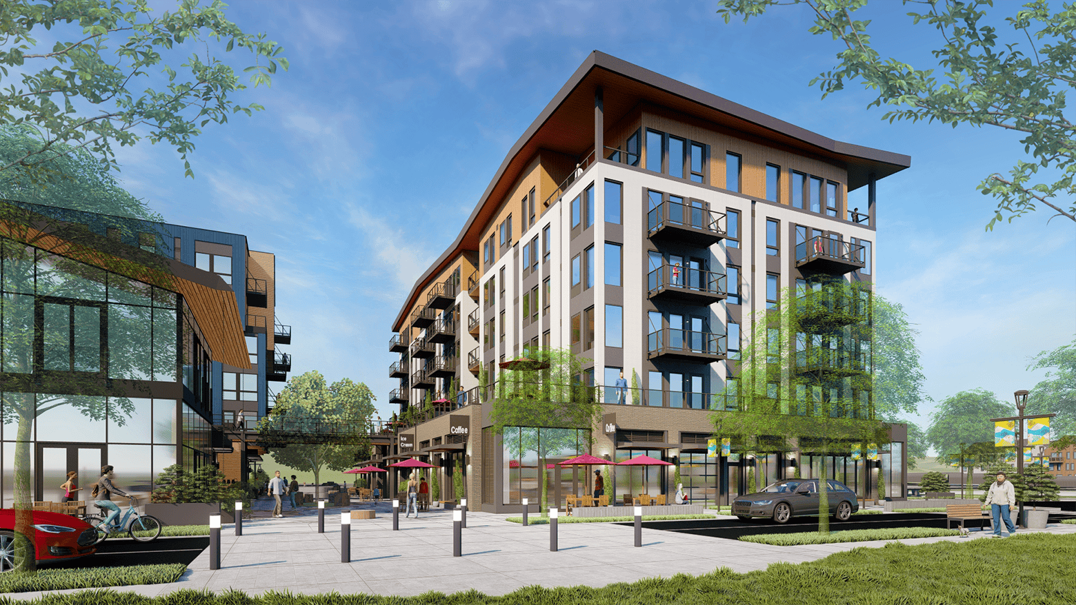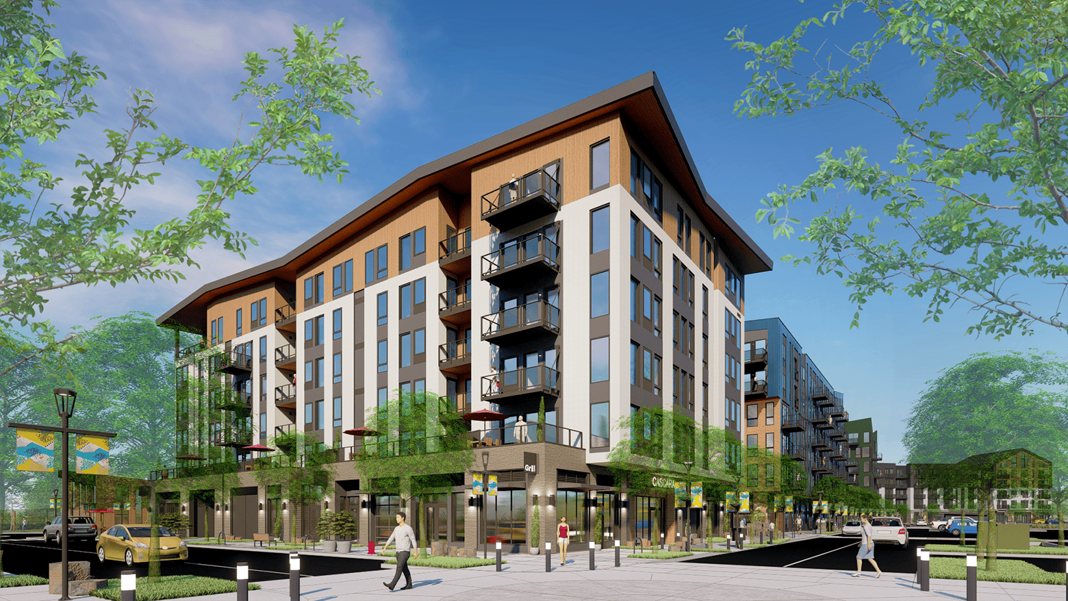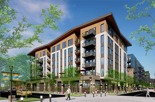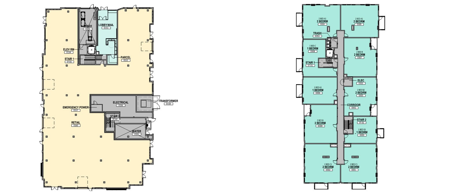 Cascara is the simplest building plan and program in Hyas Phase 1 development with retail on the ground floor with support spaces and residential units above. The top floor units step back to have deep, covered balconies for the occupants to enjoy their river and mountain view. This building also connects to the adjacent building, Broadrock, at the second floor. This allows the residents of Cascara to directly enjoy the terrace and community space there.
